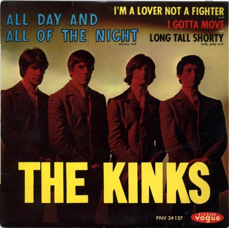 Chronologiquement c’est le deuxième disque des Kinks paru en France et le premier qui leur est entièrement consacré pour les quatre titres. En 1964, les Kinks forment un groupe très prometteur et un des nombreux qui part à l’assaut de la forteresse Beatles avec des atouts certains pour la prendre. Ce ne sera finalement pas le cas, mais il leur restera quand même la satisfaction d’être un des actes majeurs de la scène anglaise pour les sixtes. Derrière cela, l’atout principal est Ray Davies (guitare rythmique, chant), un extraordinaire et habile compositeur qui sait trouver le truc qui fera le hit. A ses côtés son frère Dave (guitare solo, chant), Pete Quaife (basse), disparu récemment et Mick Avory (batterie), c’est la composition standard de l’heure d’or. Les deux frères tiennent la vedette reléguant un peu les autres en arrière plan. L’alchimie est toutefois parfaite musicalement, pas toujours sur le plan relationnel. Après un démarrage en trombe avec leur troisième 45 tours anglais « You Really Got Me », ils sortent « All Day And All Of The Night ». Par rapport au précédent, ce n’est pas complètement différent, mais la mélodie accroche complètement. Paroles simplistes, plus tard Davies se fera plus poète, cela n’empêchera pas le succès de se renouveler. En France sa publication est magnifiée par une très belle pochette, photo empruntée à l’album anglais contemporain, montrant les Kinks en habits 19ème siècle en contre-jour. A noter que la suite des pochettes de leurs disques, les membres toujours élégants, sera une des plus belles publiés par une maison de disques pour un artiste. Le fan français est immédiatement attiré par ce disque qui sera ici une grosse vente et à ma connaissance le seul réédité vers 1967, logo différent, même pochette. La face B du simple anglais figure ici « I Gotta Move » un de ces titres dont Davies à le secret. Un riff simple mais ravageur. Les deux titres restants sont extraits de l’album anglais, « I’m A Lover Not A Fighter », emprunté à Lazy Lester, plein de punch et « Long Tall Shorty » de Don Covay, qui n’est pas sans rappeler le fameux « High Heel Sneakers ».