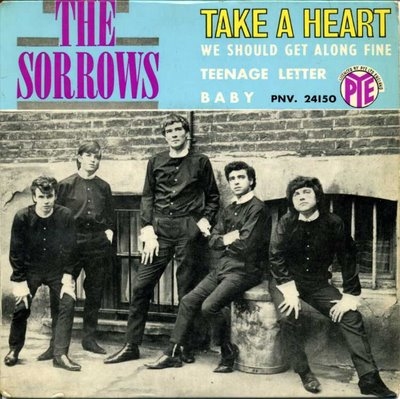 Les Sorrows ont une carrière plutôt brève, tout se joue pour le meilleur entre 1965 et 1967. Ils furent heureusement assez vite récupérés par l’histoire qui les encensa une dizaine d’année plus tard, en laissant quelques regrets. Il est de bon ton aujourd’hui d’acclamer tout ce qui a pu enregistrer le moindre disque dans les années 60, le plus souvent d’obscures créations qui méritent de le rester. Et puis il y a les autres, ceux qui proposèrent du matériel créatif, mais qui eurent de la peine à s’imposer au premier plan. Les Sorrows c’est un peu cela, à peine un peu plus. Ils viennent de Coventry et cherchent à Londres de quoi faire fortune. Ils réussissent à se faire signer pour le compte des disques Piccadilly, une sous-marque de Pye. Leur musique est plutôt remuante, ils sont habillés de noir sur les photos et se donnent un petit air de méchants. Ils enregistrent deux disques qui passent complètement inaperçus. Pour le troisième, les choses bougent. Ils ont la chance de rencontrer un compositeur producteur de talent, Miki Dallon. Ils enregistrent une de ses compositions « Take A Heart » aussi enregistrée par Boys Blues. C’est assurément le truc qu’il faut pour briser la glace. Le titre est très original, l’intro avec la batterie et la guitare basse qui suggèrent un battement de coeur. Le tempo est plutôt calme, rompu au milieu du disque par un solo de guitare explosif. Bien que pas très commercial, le disque réussit quand même à se hisser au milieu des charts, leur offrant une mise en lumière bienvenue. Cela encourage la maison de disques à publier leur unique et très rare album. En France, l’accueil est plutôt bon, les titres sont édités sous la forme habituelle en 4 titres, reprenant les deux titres du 45 tours anglais précédent pour compléter. Un peu plus tard sortira aussi l’album, identique avec un lettrage plus visible. Ils sont bien épaulés par le magazine Disco Revue qui publie quelques éloges sur le groupe suite à leur passage à Paris au fameux club, La Locomotive. Le phénomène ne gagnera jamais les grandes foules, mais sera bien suivi par les plus branchés qui achèteront leurs disques et qui nous permettent aujourd’hui de s’en procurer une copie avec parfois bien de la peine. Avec le temps et la réputation acquise plus tard, cela en fait un groupe où toutes les pièces originales ont valeur de pièce de collection avec un prix en rapport. Cette publication, magnifiée par « Take A Heart », rappelle que 1965 fut un grand cru dans l’histoire de la musique, une année de transition entre un certain passé et un avenir prometteur. Les Sorrows avaient un potentiel certain d’excellents musiciens, potentiel certainement mal exploité par manque de réussite commerciale. Pour s’en persuader, il suffit d’écouter le disque suivant « You Got What I Want« , qui ne sortira jamais en France bien qu’il existe un second 4 titres postérieur, encore plus difficile à dénicher. Leur fameux titre fut aussi enregistré en allemand et en italien. La version italienne connut un bon succès en Italie et leur permit de démarrer une seconde carrière assez fructueuse, mais moins intéressante. Elle se poursuivit jusque à la fin des années 60. En 1966, Don Fardon, le chanteur, quitte le groupe et entame un carrière qui sera ponctuée par un hit international en 1969, « Indian Reservation« . En 2012, une réincarnation du groupe est remontée sur scène.