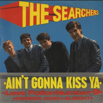 En 1963, les Searchers sont en concurrence sérieuse avec les Beatles. Ce ne sont pas des prétendants, mais de rivaux. Le moindre de leur disque est no 1, ou au pire no 2. Ils sont incontestablement en terme de succès le groupe de Liverpool le plus populaire avec les Beatles. Comme eux, ils ont pas mal séjourné au Star-Club de Hambourg. Ce qui leur manquera le plus, c’est un duo de compositeurs comme Lennon et McCartney. Qu’importe, ils sont d’excellents musiciens et savent dénicher le chanson qui fera le succès, parmi le gigantesque répertoire des musiciens américains connus ou inconnus. Justement leur premier disque « Sweets For My Sweet » (Ma Biche- Frank Alamo), est immédiatement un no 1 et connait un succès retentissant. Cela leur vaut un premier album « Meet The Searchers » qui ne contient que des reprises, mais qui connaît un succès considérable. Les reprises sont mises au goût de Liverpool et c’est potentiellement très aguicheur, magnifié par le chant de Tony Jackson, le bassiste. C’est tellement fort que plusieurs titres auraient pu faire un succès s’il avait été sortis en single. Pour rattraper un peu ce gâchis, leur maison de disque Pye, décide d’extraire quatre titres de cet album et les publier en 45 tours. C’est un moyen d’attirer les fans qui n’ont pas tous les moyen de s’offrir un album. Emballé dans une pochette illustrée avec la reprise du nom du groupe en perspective comme sur le premier album, le titre principal est attribué à « Ain’t Gonna Kiss Ya ». C’est un choix un peu arbitraire, mais c’est vrai que la chanson est plus que séduisante. C’est la reprise d’un truc américain assez obscur, chanté auparavant par Suzie Clark et dans une autre version par les Ribbons. Ironie du sort, la chanson a été composée par un chanteur qui va devenir l’année suivante une star en Angleterre, PJ Proby. Si cette chanson est aujourd’hui connue, c’est bien à la version des Searchers qu’on le doit. Un autre titre va aussi casser la baraque, « Farmer John » un semi rock and roll de 1959 lancé par le duo noir Don et Dewey. Via la version des Searchers beaucoup plus énergique, ce titre fera les beau jours de pas mal de groupes, y compris les Hep Stars une première mouture de Abba. Le choix du titre principal aurait pu revenir aussi à « Love Potion Number Nine, composition de Jerry Leiber et Mike Stoller (Jailhouse Rock pour Presley) par les Clovers en 1959. La version des Searchers est superbe, pour moi c’est toujours la meilleure que je connaisse. Elle fera un carton aux USA une bonne année plus tard et hissera à la 3ème place des charts américains. Pour terminer, « Alright », lancé par les Grandisons. Une fois de plus les Searchers savent insuffler du punch dans un titre qui va devenir un classique grâce à leur version classe. Pour le groupe, ce disque ne  fera qu’assoir sa réputation  et connaîtra un franc succès en termes de ventes. Le preuve se voit encore aujourd’hui, il est encore relativement facile à trouver. Vu sous l’angle de Liverpool et de la Beatlemania, ce disque est un chef d’oeuvre qui peut faire de l’ombre à la production Beatles de la même époque. Historiquement, les Searchers sont une des pages importantes du Liverpool Sound. Passés maîtres dans l’art de la reprise pour en faire des perles, tous les fans des sixties connaissent quelques chansons qui ont fait les beaux jours de leur adolescence, via un tube des Searchers. Le France n’échappe pas à ce phénomène, Frank Alamo, Michel Page, Claude François, Michèle Torr, Petula Clark, Richard Anthony ont un tube des Searchers à leur répertoire. Le groupe lui-même en a chanté quatre dans notre langue. Une pièce de collection que les fans du monde entier convoitent.