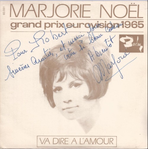 J’adore les puces, on y fait parfois de belles trouvailles. Souvent en achetant un objet, on peut philosopher sur le pourquoi de la séparation entre son propriétaire et l’objet lui-même, son histoire, car il en a toujours une. Lassitude, oubliettes, même la mort peut entrer en ligne de compte. Voici justement un truc que j’ai trouvé récemment. Un disque de Marjorie Noël, chanteuse de la période yéyé, star éphémère dans le paysage audiovisuel français, elle fut une bien plus grande vedette au Japon où on la chante encore. Ici on se souvient surtout d’elle pour avoir représenté Monaco à l’Eurovision en 1965, l’année où France Gall l’emporta avec sa poupée griffée Gainsbourg ou encore la voix féminine dans « Jolie Frimousse » de Frank Alamo. Comme bien de ses consoeurs, victime des côtés véreux du showbiz, elle abandonna complètement et se maria en 1968. Elle décéda en 2000 d’un accident cérébral. Ce disque trouvé, en plus de ça en superbe état, appelle une petite réflexion sur la subtilité de la vie de vedette. Il comporte une grande dédicace pour un certain Robert qui semble lui avoir fait un beau cadeau, dédicace en retour sur investissement en quelque sorte. Une bien belle écriture qu’elle avait cette Marjorie, une écriture généreuse. Elle se termine par la mention « à bientôt », se sont-ils revus? Hasard ou pas, son mari s’appelait justement Robert. Le début d’une histoire d’amour? Un disque atterri par hasard là ou je l’ai trouvé, à des centaines de kilomètres où ils ont vécu? Vous voyez, les puces, on y achète plus qu’un simple objet.