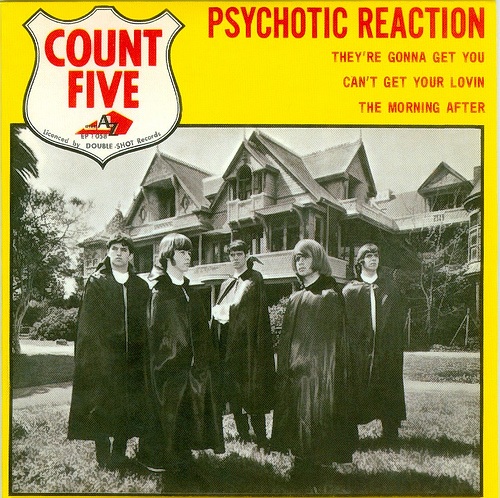 En 1966, la mode passe au psychédélique, c’est bien sûr un courant qui nous vient des USA. Il est une réponse à l’invasion anglaise qui débuta en 1962 avec les Tornados, suivis des Beatles. Pour cette année-là, très peu de disques sont édités en France et encore moins programmés par les radios, à l’exception de ce qui pouvait concerner les très grands artistes comme Beatles ou Stones. Toutefois ils n’étaient pas spécialement représentatifs de ce mouvement vu sous l’angle américain. Parmi ces très rares publications, il y a celle qui nous intéresse aujourd’hui, le 4 titres des Count Five publié chez AZ. Il y a une bonne raison à cela, le titre « Psychotic Reaction » est à la 5ème place du hit parade US. Le créativité de ce titre est assez étonnante quand on sait que c’est un original composé par les membres et qu’ils sont âgés entre 17 et 19 ans au moment de son enregistrement. On peut imaginer que cela aurait été totalement impossible en France de voir un tel disque sortir des studios nationaux. On peut imaginer le peu de cas que l’on aurait fait à ce genre de démarche musicale et aussi au vu de leur âge. Quoiqu’il en soit, il a quand même été publié ici sous licence du label Double Shot basé en Californie, d’où ils sont originaires. Le disque n’a jamais passé à la radio, du moins je ne l’ai jamais entendu. C’est encore une bizarreté quand on sait que le label AZ a été fondé par Lucien Morrisse, ex-mari de Dalida, et directeur des programmes à Europe No 1. Quelques passages à Salut les Copains et c’était sûrement une bonne vente assurée. Heureusement quelques disquaires eurent la bonne idée d’en proposer une copie au client, client dont je fus, séduit par l’originalité de la chose. La pochette était aussi attirante, bien pétante avec son fond jaune et lettrage rouge, présentant le groupe vêtu de ces pèlerines noires tout droit sorties d’un film de Dracula.