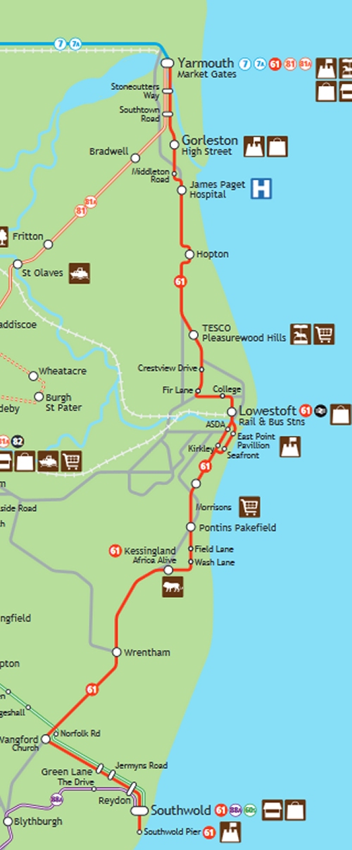 Il s’agit d’un bus d’une compagnie de transport. Recherche, cela confirme qu’il existe bien une compagnie de ce nom à Norwich. Bien plus important c’est le numéro du bus, le 61. Ce n’est pas très visible ici, mais il y a le nom d’une destination qui est Southwold. Je prends le plan de la compagnie et je garde ce qui m’intéresse: