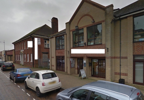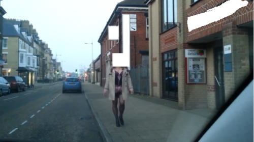 Pour ne pas nuire à la personne, ce n’est pas mon intention, je vais me faire un peu plus discret dans mon descriptif et masquer certains indices. Grâce à l’enseigne d’un nom d’hôtel au centre de la photo, j’ai pu situer la ville. Comme le nom de cette hôtel doit être aussi courant en Angleterre que l’hôtel de France en France, il m’a fallu attraper un no de téléphone mentionné sur une des pancartes à droite de la partie masquée. Remarquez que la personne qui nous intéresse a son manteau ouvert et l’on peut voir son slip et ses bas. Le résultat m’a donné le nom d’un lieu et une adresse. Exploration sur Streetview:
