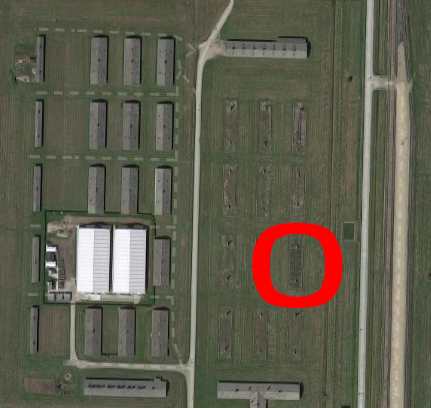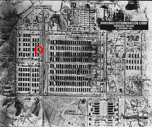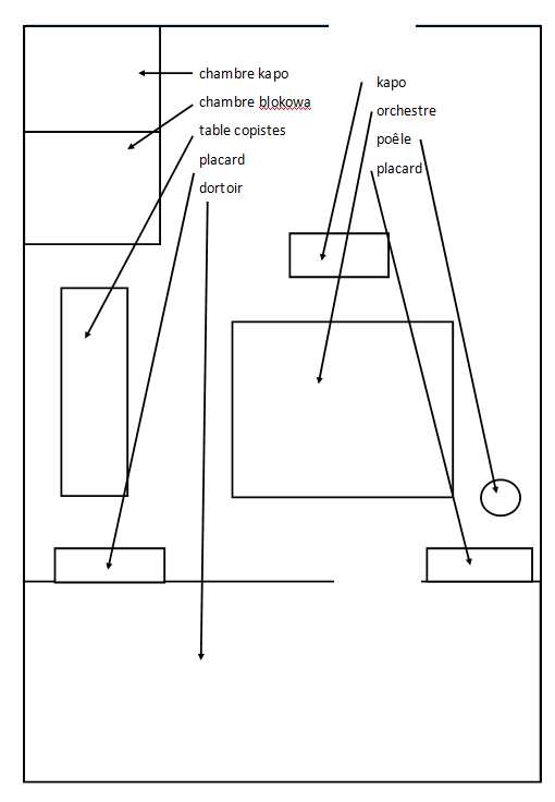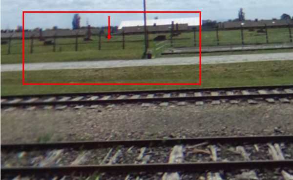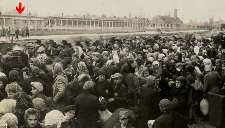 Arrivée de déportés, la baraque des musiciennes se trouve sous la flèche rouge. Elles les voyaient passer en direction des chambres à gaz, dont une est la maison avec la haute cheminée à droite.