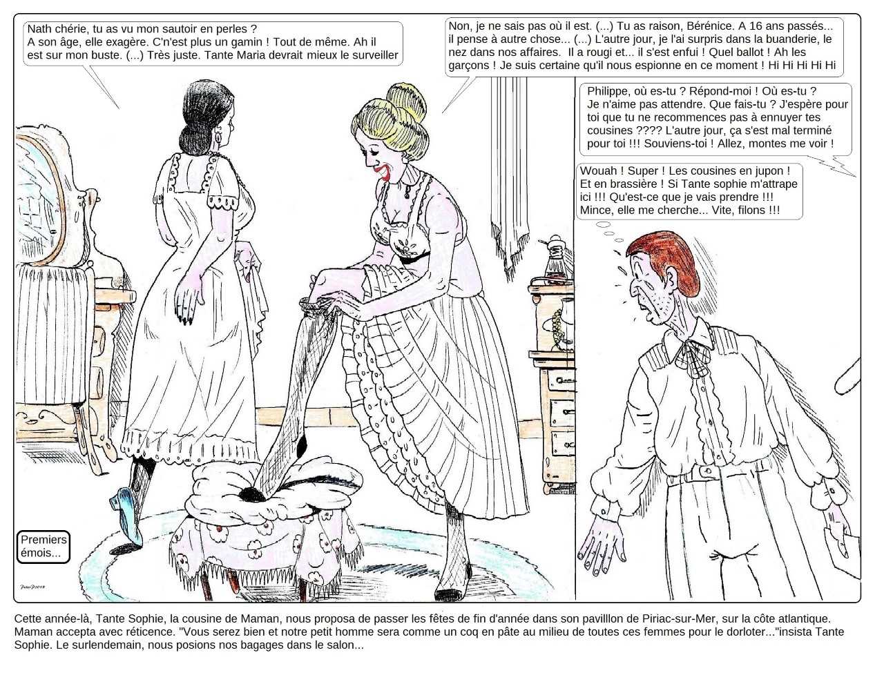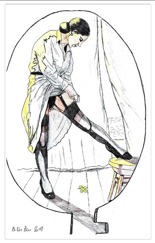 Notre fidèle visiteur Peter Pan, que vous aurez remarqué pour ses doctes commentaires sur mon blog, a d’autres atouts dans son jeu. Vous ne le saviez pas, et c’est là l’avantage d’être un animateur de blog, il a parfois le crayon qui le démange. Il a bien raison car ses dessins sont plutôt admirables, c’est du beau travail. Comme tous les amateurs du genre, il aime se faire un peu coquin et dessiner autre chose que des papillons qui se posent sur les fleurs. Sans pour autant que cela soit des dessins autobiographiques, il aime représenter des scènes qui rappelleront certains souvenirs cuisants de l’enfance et notre curiosité pour les interdits. Il peut aussi s’égarer, mais s’égare-t-il vraiment, dans la représentation d’une belle qui ajuste sa jarretelle.