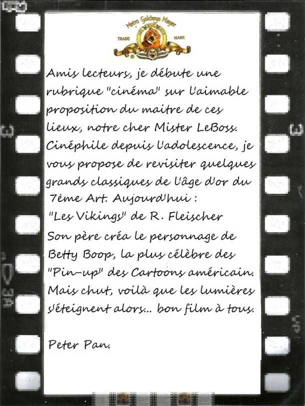 J’ai demandé à mon visiteur assidu Peter Pan, féru de cinéma, de nous mettre en lumière quelques films qu’il aime bien. Son choix est personnel sans aucune contrainte de ma part. Je le remercie de sa participation à ce moment culturel.