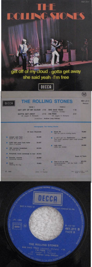 Certaines de ces rééditions conservèrent tout au long de leurs parcours, la même pochette recto et verso. Mais dans trois cas, à la fin du cycle vers 1970-72, trois de ces rééditions arborèrent une pochette différente, ouvrant la chasse aux collectors. Une des raisons est je pense avant tout commerciale, Decca voulait mentionner au verso son catalogue actuel et non plus des disques qui n’existaient plus dans leur catalogue, comme c’est le cas pour le premier de la série. Il est certain qu’en 1972, acheter un disque sous forme de EP, relevait un peu de l’erreur de goût, le single ou les albums avaient supplanté depuis longtemps ce bon vieil EP. Ils sont de ce fait rares ou très rares et constituent une recherche prioritaire pour les mordus des éditions françaises. Celui qui a battu tous les records aux enchères, est justement celui qui contient « Get Off Of My Cloud » avec comme nouvelle photo, les Rolling Stones sur la scène de l’Olympia.