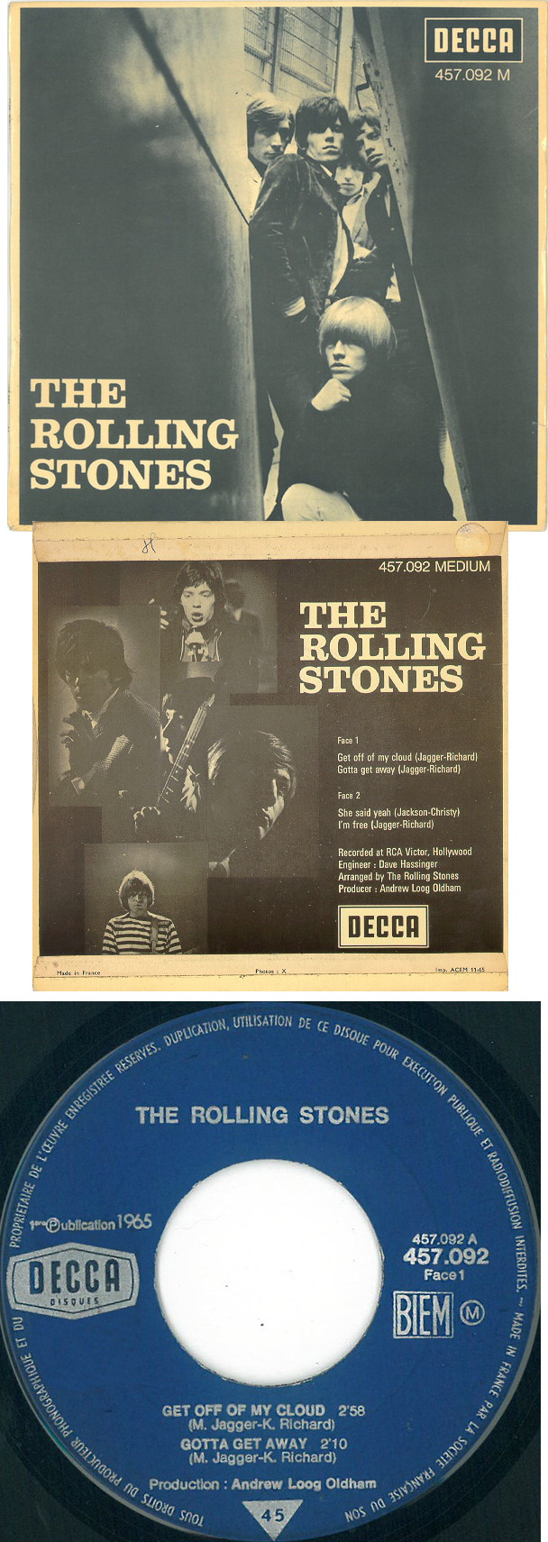 Nous avons vu récemment, avec les Beatles, comment les rééditions peuvent engendrer de futurs collectors. Il existe un cas semblable avec les Rolling Stones, bien qu’il s’agisse d’une pièce un peu moins cotée que celle des Beatles. Alors, un peu d’histoire. Le tube qui acheva de hisser les Rolling Stones sur le plan international fut « Satisfaction », suivi de « Get Off Of My Cloud », au succès un peu plus modeste. Ce titre fut bien entendu publié en France sous la forme d’un EP par Decca avec le numéro de catalogue 457.092. La photo de la pochette reprend celle de l’album anglais « Out Of Your Heads », ils sont entassés dans un étroit escalier. Decca France cessa pratiquement la publication en EP, du moins pour les Rolling Stones à partit de 1967. Cependant les EP’s déjà publiés continuaient de se vendre plutôt bien. Donc on continua de les rééditer sous cette forme jusqu’en 1972. Selon l’impact commercial du disque, ils furent réédités plusieurs fois. Le pistage des rééditions est plutôt une affaire de spécialistes ou de chasseurs avides de compléter, souvent un petit détail permet de les différencier, principalement une date d’impression ou le nom d’un imprimeur. Dans les différences assez visibles notons celle-ci, à partir de 1967 le logo du disque est différent et ne mentionne pas toujours la date de la première publication, le label Decca est encadré dans un rectangle et non plus un hexagone.