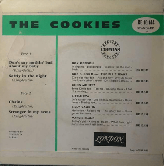 C’est un peu le cas pour les Cookies, ce trio vocal noir américain né d’un remaniement des Raelettes de Ray Charles, fut engagé par le célèbre duo de compositeurs Gerry Goffin et Carole King pour leur label Dimension. Le groupe connut 2 grands succès composés par les mentors du label « Chains » et « Don’t Say Nothing Bad About My Baby ». Comme presque toujours avec les artistes noirs, c’est vocalement splendide. On les connait en France pour le premier « Chance » par Johnny Hallyday et le second « Ne Dis Pas Du Mal De Mon Amour » par Frank Alamo, les Gam’s, et même par Dany Saval. Ce qui ajoute un peu à leur gloire, c’est la reprise de « Chains » par les Beatles sur leur premier album, de ce fait le groupe ne retombera jamais tout à fait dans l’oubli.
