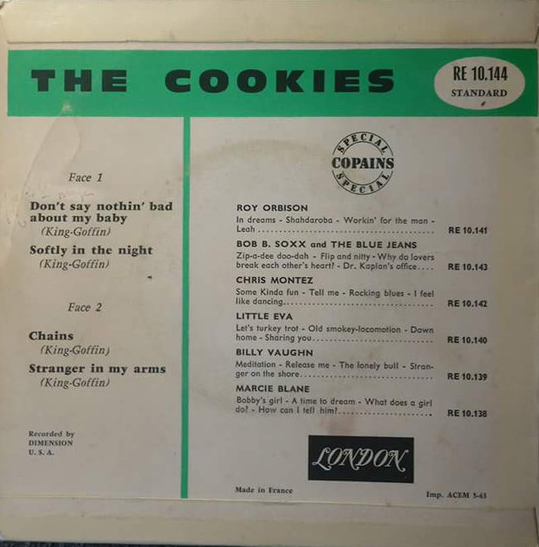 C’est un peu le cas pour les Cookies, ce trio vocal noir américain né d’un remaniement des Raelettes de Ray Charles, fut engagé par le célèbre duo de compositeurs Gerry Goffin et Carole King pour leur label Dimension. Le groupe connut 2 grands succès composés par les mentors du label « Chains » et « Don’t Say Nothing Bad About My Baby ». Comme presque toujours avec les artistes noirs, c’est vocalement splendide. On les connait en France pour le premier « Chance » par Johnny Hallyday et le second « Ne Dis Pas Du Mal De Mon Amour » par Frank Alamo, les Gam’s, et même par Dany Saval. Ce qui ajoute un peu à leur gloire, c’est la reprise de « Chains » par les Beatles sur leur premier album, de ce fait le groupe ne retombera jamais tout à fait dans l’oubli.