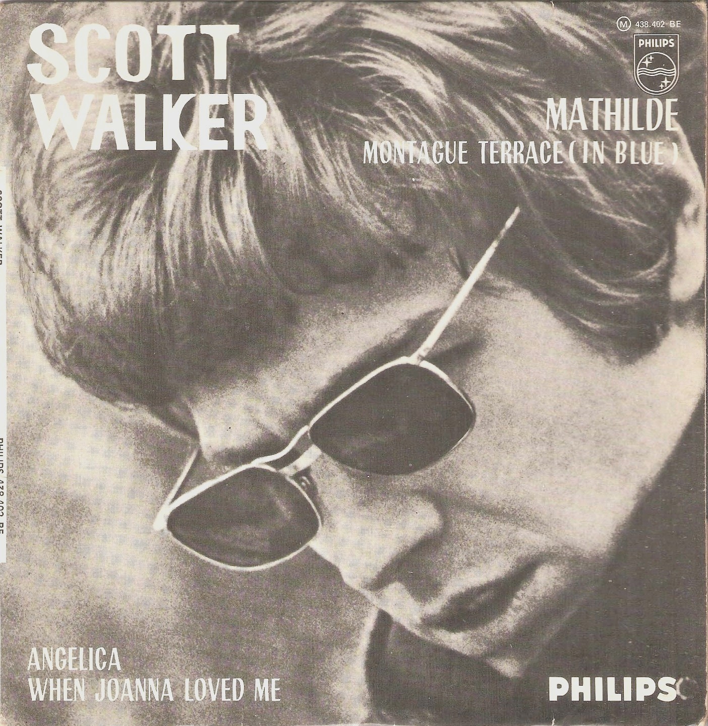 Scott Walker est un Américain qui commença sa carrière en 1957 comme chanteur pour teenagers, sous son véritable nom Scott Engel. Il a certains avantages, il est plutôt beau mec et surtout possède une très belle voix qui fera de lui un crooner plus tard. Il ne rencontre pas vraiment le succès dans son pays natal, son seul aperçu de succès sera comme bassiste des Routers qui cartonnèrent en 1963 avec leur célèbre « Let’s Go ». En 1964, puisque les Anglais envahissent les USA, il forme un trio qui va tenter sa chance en Angleterre. Et cela marche, sous le nom de Walker Brothers ils cartonnent avec des succès qui font hurler de joie toutes les minettes du Royaume Uni et quelques autres pays. Leur musique aux mélodies et arrangements grandiloquents ne sont pas sans rappeler Phil Spector. En 1967, il entame une carrière solo, pas vraiment interrompue par une reformation du groupe couronnée de succès vers le milieu des seventies, mais surtout il affirme ses visions musicales qu’il peut assurer de sa voix de crooner. Il est passionné de culture française, littérature et musique. Il a presque une divination pour Jacques Brel, dont il enregistra neuf chansons en anglais, dont huit sont des premières versions anglaises. Elles sont presque littéralement traduites en anglais par les soins de Mort Shuman. Sa reprise de « Jackie » lui vaudra d’être interdit sur les ondes de la BBC. Sur ce seul et unique EP français, on retrouve sa version de « Mathilde », superbe reprise pleine de punch. La chanson « Montague Terrace (In Blue) » montre ses talents de compositeur à travers ces ambiances musicales un peu bizarres dont il a l’habitude. Le « Angelica » de Gene Pitney figure aussi ici, sans doute pas tout à fait par hasard, car au même moment elle cartonnait en français via la version de Nicoletta « La Musique ». Le dernier titre est une reprise de Tony Bennett, le crooner américain. Scott Walker a poursuivi une carrière fructueuse de crooner. Mais il n’en est pas un tout à fait comme les autres, sa musique très élaborée confine parfois au surréalisme, mais toujours suivi par des fans fidèles, quasiment une icône. Il est décédé en 2019. Il est taxé par un critique : « L’une des figures les plus énigmatiques et influentes de l’histoire du rock. »