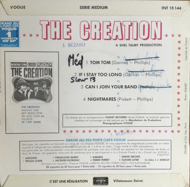 A écouter le groupe Creation, auparant les Mark IV, on remarque bien qu’ils sont assez proches des Who, pour ne pas dire qu’ils les imitent. Le groupe a malgré tout une certaine créativité et ils se distinguent par un répertoire constitué principalement de titres originaux assez accrocheurs. Le guitariste du groupe Eddie Philips est selon toute les anecdotes, le premier qui tira des sons sur scène en frottant un archet sur sa guitare. On verra aussi un peu plus tard Ronnie Wood, le futur Rolling Stones, dans les rangs du groupe. Malgré tout, cela ne marche pas très fort en Angleterre, mais ils connaissent une certaine popularité en Allemagne ou l’on verra un album et un best of édités. Mais c’est aussi un groupe qui fabrique les collectors à la pelle. Redécouverts dans les années 1980, on recherche évidemment les pièces originales. C’est encore une fois la France qui se distingue par les deux EP’s publiés en 66 et 67, magnifiés par deux splendides pochettes, très représentatives du courant « mod » très en vogue à cette époque. Le deux sont rares, mais le second l’est beaucoup plus, on peut même affirmer que c’est la pièce maîtresse de leur discographie au niveau collectors. C’est le genre de disques que l’on peut se féliciter d’avoir eu la curiosité d’écouter et d’acheter il y a bien longtemps.