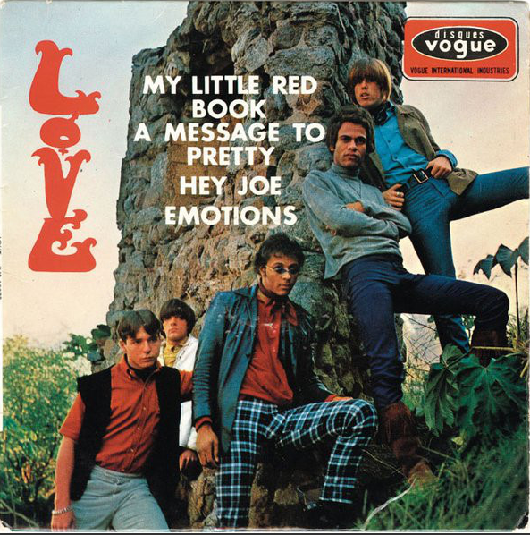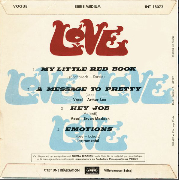 Groupe multiracial, Love est assez difficile à classer question style, garage, psychédélique, folk rock, peuvent coller avec les titres, cela dépend de ceux que l’on écoute. Si le groupe, originaire de Los Angeles connut un succès assez modéré, son influence et son aura grandira au fils des ans, principalement par la présence d’Arthur Lee reconnu comme un guitariste influenceur, mais il règne au sein du la formation une belle alchimie. Enregistrant pour le label Elektra, Vogue publie en France un premier EP en 1966. Il contient un des titres phares du groupe « My Little Red Book », une composition du fameux duo Burt Bacharach et Hal David, enregistrée initialement pas Manfred Mann, mais dans un remaniement propre à Love. On y trouve aussi le fameux « Hey Joe », chanson dont beaucoup de monde revendique la composition, mais qui est probablement un traditionnel. C’est une chanson qui à cette époque est en quelque sorte à la mode, Mise en lumière par les Leaves en 1965 qui en feront un succès, les reprises s’enchaînent puis figurera au répertoire de Jimi Hendrix avec le succès que l’on sait. Le deux titres restants sont des originaux. Toutes les publications françaises sont de jolis collectors, mais peu courants.