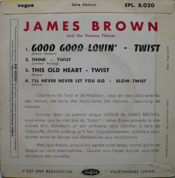 James Brown, un des rois du R&B, dut attendre presque une dizaine d’années avant de devenir une star internationale, son premier enregistrement date de 1956. La France ignora le phénomène, car c’en est un, pendant des années. La première vraie publication française date de fin 1962 et encore il fallut qu’elle se fasse de manière détournée. Le célèbre Chubby Checker proclamé roi du twist enregistra un titre de James Brown publié plus d’une année auparavant « Good Good Lovin' », ce qui le mit bien en évidence dans sa discographie à côté de ses succès twists. Sur des paroles d’Eddy Mitchell il devint « De T’aimer, De T’aimer » et fut enregistré par Les Vautours, ainsi que Gary l’Ange Noir et ses Démons ». Il existe aussi deux versions anglaises antérieures du titre publiés en France, l’une par Doug Fowlkes and The Airdales et aussi par Nancy Holloway, alors à ses débuts. Elles font référence à le version de Chubby Checker et non au titre original. Puisque ce titre était un peu devenu un twist par la force des choses, la label sur lequel enregistrait James Bond aux USA, King, publia un album contenant le titre avec la mention *Good Good Twist ». Le label Vogue qui détenait (brièvement) les droits de licence publia un EP avec la mention twist en gros, essayant ainsi de profiter de la vague avec un chanteur qui n’était pas vraiment une icône du genre.