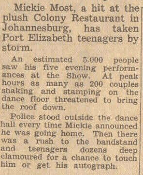 Moins connu est le fait qu’il fut aussi guitariste, compositeur, chanteur à succès.. Bien qu’il soit Anglais, c’est en Afrique du Sud qu’il fonda un groupe, Mickie Most & the Playboys. Ils ont un succès considérable puisqu’ils sont 11 fois à la première place du hit parade local avec des reprises anglaises ou américaines. Lassé par les tournée incessantes, il décide revenir en Angleterre et de continuer sa carrière de chanteur. C’est ce qu’il fait, mais il songe rapidement à s’établir comme producteur, métier qu’il estime plus tranquille et sans doute plus lucratif, il n’a pas tout à fait tort. Sur un EP datant de 1965. EMI France se décide de publier un disque avec des titres anglais période 63-64. Le titre le plus intéressant reste « That’s Allright » un original composé par Miki Dallon, qui travaillera avec les Sorrows un peu plus tard. Il fut aussi repris en français par les Chats Sauvages période Mike Shannon « Je Suis Prêt ». On peut penser que la réputation qu’il s’est faite avec les Animals n’est pas étranger à cette sortie. C’est malgré tout une pièce très rare