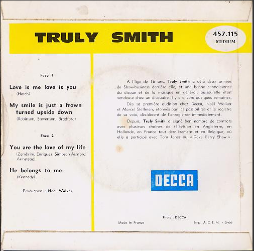 Trully Smith- Decca 457.115 M, publié en 1966, meilleure enchère sur Ebay 132 euros.