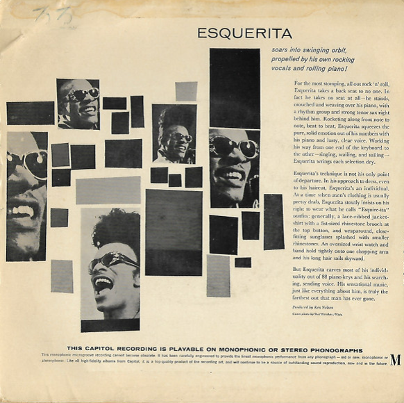 On peut considérer à juste titre que Esquerita est un clone de Little Richard, sans en avoir tout à fait la renommée. Assez bizarrement, alors que les publications rock and roll étaient plutôt parsemées en France, Capitol sortit simultanément trois EP’s en 1959, en fait des extraits d’un album américain paru la même année. Personnage flamboyant, il enregistra d’autres titres sous d’autres noms et aussi dans d’autres styles. Il eut même Jimi Hendrix comme guitariste lors d’une session. Aujourd’hui, on se souvient surtout du chanteur de rock et c’est cette période qui est recherché par les collectionneurs, sans toutefois consentir à payer des sommes folles. En 1986, il est probablement un des premiers chanteurs qui est mort du sida en 1986.