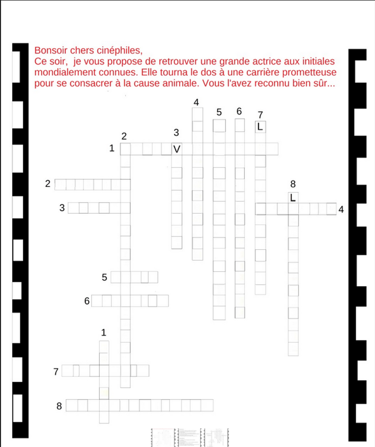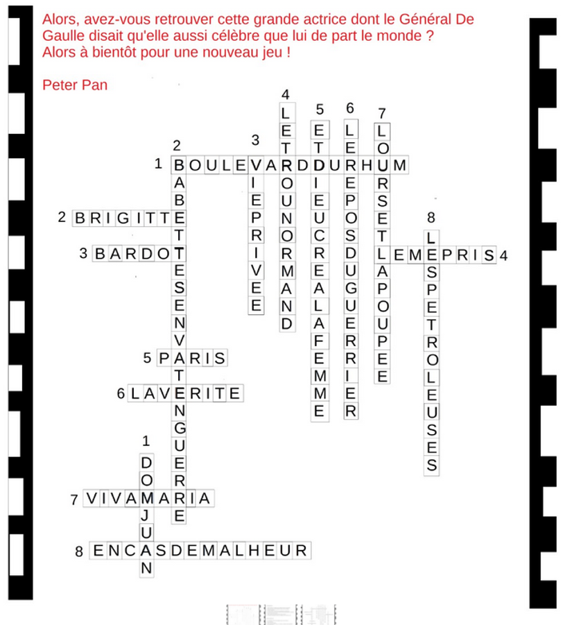 Une autre grille de mots croisés proposée par Peter Pan. Merci à lui. Vous pouvez agrandir l’image en cliquant dessus. Solutions tout en bas de la page, ainsi que des extraits de films concernant notre vedette mystérieuse.