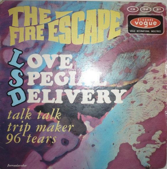Cet EP paru chez Vogue en 1967 est extrait d’un LP américain publié chez GNP Crescendo. Comme le psychédélique devenait la mode, le label produisit un LP avec un groupe inconnu, Fire Escape. L’album contient des reprises de titres assez connus plus ou moins issus du mouvement, avec néanmoins deux excellents originaux. Vogue publia un extrait de quatre titres originalement créés par Thee Midniters, Question Mark And The Mystérians, les Seeds, Music Machine. Le titre mis en exergue « Love Special Delivery », regardez les initiales sur la pochette, est une savoureuse reprise qui vaut le détour. Dommage que Vogue n’a pas mis les deux originaux sur sa publication, enfin je l’ai fait pour eux en-dessous. Un joli petit collector plutôt très rare.