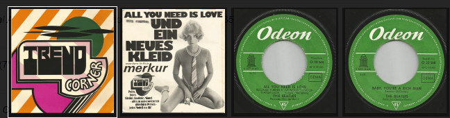En effet, les Beatles c’est très vaste. Les versions de certains albums se comptent par centaines. J’ai beaucoup de trucs, sans doute moins que vous, mais en titres cela doit être complet. L’année passée, j’ai trouvé un truc qui a d’ailleurs failli me passer sous le nez, car c’est peu visible. Il s’agit d’un single avec « All You Need… » qui était remis à l’achat en Autriche par les magasins de mode Merkur, je pense à partir d’une certaine somme. Il contient le single allemand standard mais la pochette est complètement différente et personnalisée au nom du magasin. Jamais vu avant et je ne pense pas en voir une autre copie la semaine prochaine. Comme je ne peux pas mettre de photos dans les commentaires sauf des liens, je vous ai mis une photo au bas de cet article.