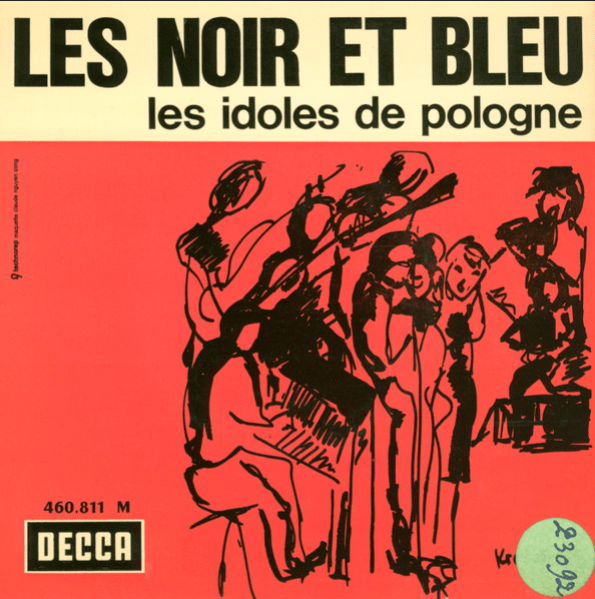 Voici une pièce très exotique qui nous vient indirectement de la situation politique après la guerre. Les pays de l’est sous la dictature communiste étaient soumis à toutes sortes d’embargos. La culture en faisait partie avec, entre autres, les mouvements musicaux « décadents » du capitalisme qui étaient sous haute surveillance. Mais il fallait aussi que la jeunesse s’amuse, on ne pouvait pas que lui faire écouter les Choeurs de l’Armée Rouge. Alors une certaine forme de musique moderne était permise, des groupes style Shadows pouvaient exister à côté d’artistes vocaux, pour autant qu’ils ne glissent pas dans leurs textes un message politiquement incorrect. Certains de ces artistes vinrent donner un récital à l’Olympia en 1963, ils sont Polonais. Decca France en profita pour les enregistrer et publier un EP comprenant quatre titres dans une sorte de compilation artistes variés. Comme les chansons sont interprétées en polonais et le nom des artistes pas toujours facile à prononcer en français, on présenta le disque sous l’appellation « Les Noir Et Bleu » avec la mention « Les Idoles De Pologne ». Bien que le style peut s’apparenter à notre variété nationale, ce genre de tentative était vouée à l’échec d’avance et les ventes furent plus que confidentielles. Les rares apparitions dans les ventes trouvent vite preneur et ce n’est pas réservé aux personnes à petit budget.