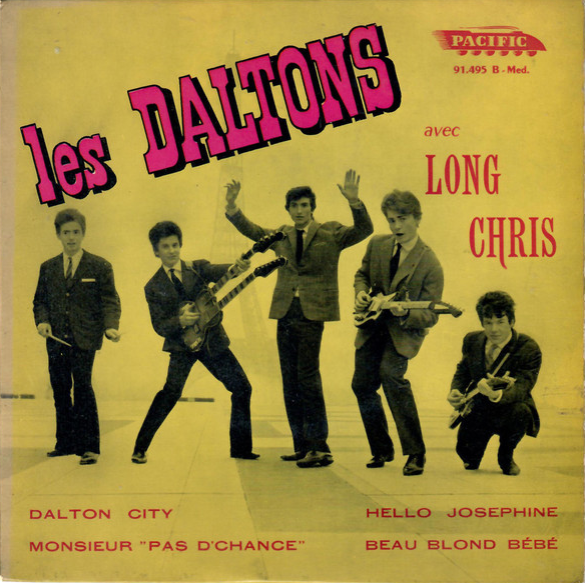 Un disque qui nous replonge dans les années twist en France. C’est la première tentative de ce groupe qui essaye de s’élever à la hauteur des plus célèbres comme le Chaussettes Noires, les Chats Sauvages, les Pirates. Long Chris est un pote à Johnny Hallyday d’avant les années glorieuses. Le succès de l’un donne l’idée à l’autre d’essayer d’en faire autant et de monter un groupe avec les Daltons comme accompagnateurs. Ils signent avec un label de moyenne importance, Pacific. Même s’ils n’obtient qu’un succès modéré, le disque a la saveur de ces années-là. Si on peut lui reprocher un manque d’originalité au niveau des titres, il se magnifie quand même par le seul original du disque « Dalton City », un instrumental à la Shadows composé par le guitariste soliste Jean-Pierre Bordi, avec qui j’ai pu faire plus ample connaissance par la suite. J’ai rencontré pas mal de gens sympas dans le showbiz, mais lui mérite une médaille de gentillesse. Les trois autres titres proviennent du répertoire de Fats Domino, Gene Vincent, Jerry Lee Lewis. Pour les deux disques suivants, ils furent signés par Philips, ce qui ne leur apporta pas plus de gloire. Le seul qui tira vraiment son épingle fut Long Chris longtemps complice de Johnny, et sa fille Adeline en fit même son beau-fils. Il fut aussi comme compositeur le responsable d’un album plutôt légendaire « Chansons Bizarres Pour Gens Etranges ».