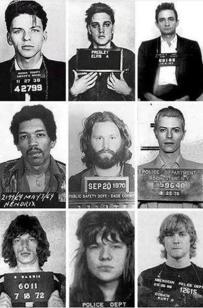 Fiches de police avec des célébrités ayant eu un jour ou l’autre des démêlées avec la loi. Il y a de gauche à droite et de haut en bas : Frank Sinatra, Elvis, Johnny Cash, Jimi Hendrix, Jim Morrison, David Bowie, Mick Jagger, Janis Joplin and Kurt Cobain. La seule qui est « fausse » est celle d’Elvis Presley, il s’agit d’une photo pour le service militaire. Remarquez que celle de Frank Sinatra date de 1938, il n’était pas encore une star. Il fut arrêté pour adultère ce qui à l’époque constituait un délit. Pour las autres on devine plus ou moins les raisons de leur arrestation. On l’oublie un peu, mais Sinatra fut un ardent militant de la cause noire, il refusait de se produire dans des alles où les Noirs n’étaient pas admis. Kurt Cobain fut arrêté pour avois sprayé une voiture.