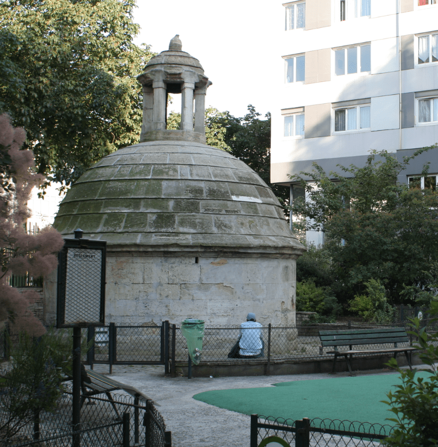 Continuons de flâner dans le même rue et arrêtons nous vers le no 213. Vous remarquerez un petit jardin dans lequel trône une étrange construction. A moins d’être féru en histoire locale, il vous échappera sans doute les raisons de sa présence en ces lieux. Il faut remonter l’histoire de Paris jusqu’au 13ème siècle. Quand on pense à un endroit qui surplombe Paris, c’est bien entendu Montmartre qui vient à l’esprit. Cette colline n’est pourtant pas la seule, il en existe une autre tout aussi haute, celle de Belleville. La composition de son sol est un peu différent, il s’agit surtout de sable et de glaise. Paris n’est pas en Angleterre, mais les petites averses et la pluie prennent un malin plaisir à arroser la capitale de temps en temps. Sur la colline de Belleville, cette eau ruisselle et descend la pente car le sol est pratiquement imperméable. L’approvisionnement en eau a toujours été un souci parisien, il y a certes la Seine, mais selon l’endroit où l’on habite c’est un peu loin pour aller remplir son seau. De plus, si le monsieur que l’on aperçoit 200 mètres en amont a fait pipi dedans, l’eau fraîche n’est pas garantie. L’eau qui descend de la colline a un avantage indéniable, elle est pure car c’est de l’eau de pluie. A partir de ce fameux 13ème siècle on décide de capter cette eau avant qu’elle ne soit souillée et l’on construit petit à petit un réseau d’aqueducs souterrains qui alimenteront finalement les fontaines de Paris et le quartier des Halles. Des moines, d’abord pour leur usage personnel, puis les rois de France, entreprennent leur construction. Il faut bien s’imaginer que le Paris de cette époque occupe surtout un petit territoire de quelques centaines de mètres autour de l’île de la Cité. Ce drôle de monument visible ici et construit à la fin du XVI siècle, se nomme Regard de La Lanterne, il est une des tours utilisées pour pénétrer dans l’aqueduc. Depuis 150 ans, il n’a plus de fonction technique, mais l’eau y coule toujours. Occasionnellement on peut y pénétrer lors de visites guidées, mais le jardin est accessible à tous.