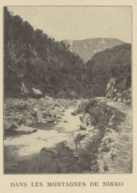 A midi, le Chuzenji était en vue. Sa couleur bleue foncée, ses belles rives montagneuses me rappelèrent nos lacs alpestres. Au fond, la pyramide boisée de la montagne Nan-tai-zan, pèlerinage renommé.