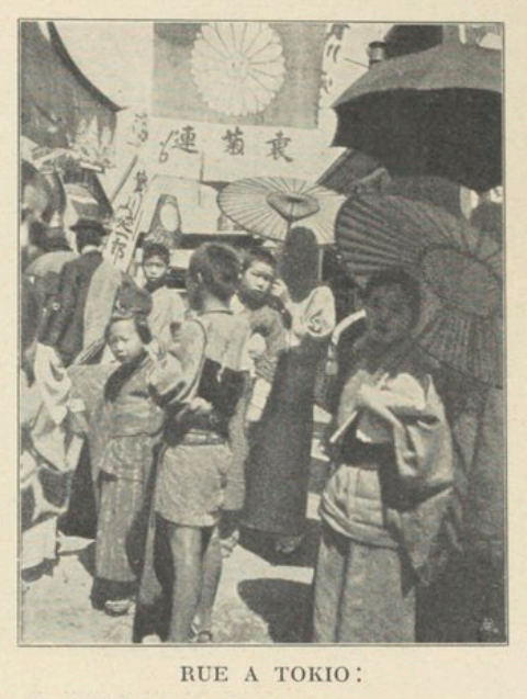 Si jamais mon ignorance de la langue d’un pays et l’absence de guides me mirent dans l’embarras, ce fut certainement à mon arrivée à Tokio, capitale du Japon. Un orage terrible nous avait retardés de deux heures. Lorsque, vers minuit, nous fûmes à destination, un essaim de petits hommes jaunes m’assaillit d’offres de service. Mais aucun ne comprit que je désirais me rendre, avec mon bagage, à l’hôtel impérial. A bout de science, j’avisai une jinrikisha et roulai pendant près d’une heure, par la nuit noire, à travers deux rangées de maisons basses qui n’en finissaient pas. Un immense village, plutôt qu’une ville, la capitale de l’Empire japonais. Cette première impression subsista dans la suite, et pourtant Tokio compte 2,000,000 d’habitants. Je pouvais y errer toute une journée sans y rencontrer plus de trois ou quatre Européens.