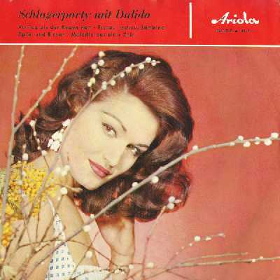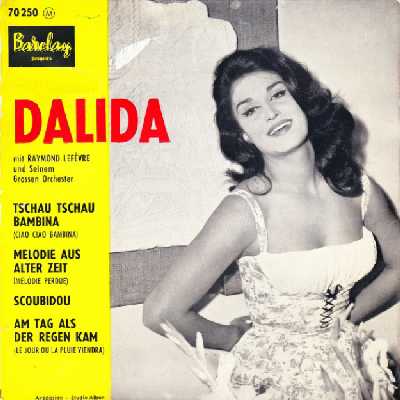Dalida – En Allemagne au cours des années d’après guerre, un peu comme en France, il y avait une certaine demande pour des musiques un peu exotiques, l’Italie pouvait tout à fait répondre à ce critère. Ce n’était pas encore les grandes ruées germaniques vers les plages de l’Adriatique, mais on en rêvait un peu. La musique pouvait en donner une petite idée, à défaut de mieux. Dans les années 1950, vers la fin, Dalida fut la première à s’attaquer d’une manière conséquente au marché allemand. Pendant une vingtaine d’années, elle alimenta assez régulièrement en enregistrements, des chansons destinées au public allemand. Bien évidemment, les chansons en français furent les plus nombreuses, mais n’oublions pas qu’elle avait du succès en Italie, elle enregistra évidemment en italien, mais encore en anglais, égyptien, espagnol, flamand, libanais, hébreu, japonais. La discographie allemande a ses particularités, une partie reprend sa discographie française, mais aussi des titres souvent très connus pour nous, dont elle n’est pas la créatrice, mais qui sont recyclés en version allemande ou en exclusivité pour l’Allemagne. Ces titres dans ces versions apparaissent peu ou pas dans sa discographie française. Un exemple connu de tous les fans de Dalida. En 1959, elle « pique » la fameuse histoire de Scoubidou à Sacha Distel, l’enregistre en allemand. Il finit inséré sur un EP Barclay avec trois titres aussi chantés en allemand. Il est destiné à l’export vers l’Allemagne avec un texte de présentation dans la langue du pays. A cette époque, ce sont les disques Ariola qui distribuent Dalida, mais Barclay tente le coup en passant un peu par la bande. Ce fut un peu un coup d’épée dans l’eau, car Ariola sort sa propre édition avec un ordre de titres différent. Je ne sais pas à quel canal de distribution il a été confié, mais visiblement le travail ne fut pas à la hauteur, c’est un des trucs les plus rares de la discographie de Dalida, ce qui n’est pas toujours le cas de bien des publications de l’autre côté du Rhin. Si toutes les publications du genre ne furent pas des succès fracassants, au moins quatre d’entre elles connurent une belle consécration, dont deux furent no 1.