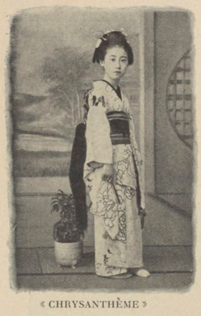 Chrysanthème devint songeuse. Les yeux brillants, elle se mit à raconter la proposition de l’étrangère à ses compagnes réunies autour d’elle et une discussion animée ne tarda pas à s’engager. Mais la mousmé était encore méfiante; car lorsque, le soir, M. M. lui demanda: «Eh bien, petite, as-tu fait ta malle?» elle répondit: «Il me faut d’abord la promesse par écrit que je recevrai un obi comme vous me l’avez dit; sinon rien n’est fait.» Et rien ne fut fait. Je partis le lendemain sans ma jolie fleur de chrysanthème que je n’aurais pas eu le cœur de transplanter sous un autre ciel.