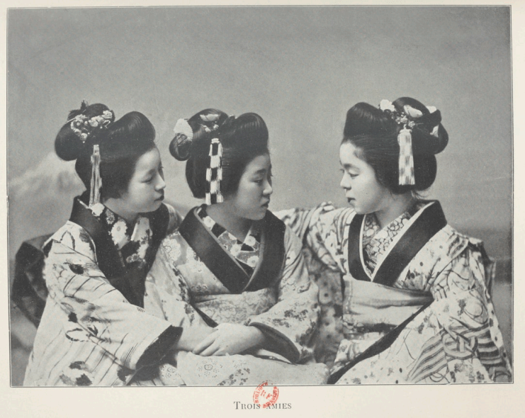 A l’hôtel de Miyanoshita, il n’y a que des femmes pour le service, les petites nésans qui trottinent affairées dans la maison. Elles ne portent aucun bijou, les mousmés; leur seul luxe est l’obi, la large ceinture de soie qui retient leur kimono. Cet article de toilette a failli me faire faire l’acquisition d’une petite servante japonaise! La mignonne nésan qui nous apportait nos repas — elle avait 15 ans — s’appelait Chrysanthème. M. M. qui parle parfaitement le japonais, lui dit un jour: «Chrysanthème, cette dame veut t’emmener chez elle, loin, bien loin d’ici, dans un pays où il n’y a pas rien qu’un Fouji-no-yama— volcan le plus connu du Japon — mais beaucoup de montagnes plus belles encore.» L’enfant secouait énergiquement la tête. « Elle te donnera un obi magnifique qui coûtera au moins cent yen » (1 yen =fr. 2.50).