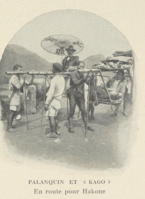 Le chemin de Hakone n’est pas praticable aux véhicules; on n’y monte qu’à pied, à cheval ou en kago. Il y a deux espèces de palanquins: celui du pays, exigu, étroit, où peut prendre place le petit Japonais grâce à ses membres très souples, et les chaises à porteurs américaines, construites sur le modèle que l’on rencontre dans nos montagnes, et qui tient compte des jambes longues et raides des étrangers. Je choisis naturellement ce dernier numéro; mais voyant mes quatre petits coolies suer et haleter sous les deux forts bambous placés sur leurs épaules, je descendis à la première rampe de la route.