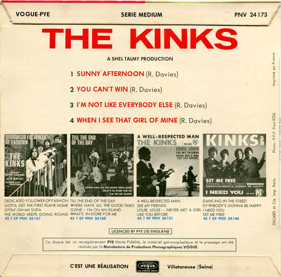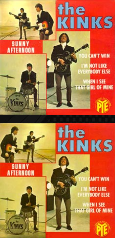 Parmi les collectionneurs et fans d’un artiste ou d’un autre, il y a des publications, qui si elle n’atteignent pas des prix exorbitants, obligent les collectionneurs à passer au moins deux fois à la caisse. Le disque dont nous allons parler en fait partie. Il n’est pas d’une rareté exceptionnelle, mais il se vend quand même un peu plus cher qu’un disque courant dans les deux versions qui existent. Si je devais élire un artiste pour les plus belle pochettes de EP’s publiés en France, je voterais pour les Kinks. Sur les 13 EP’s publiés entre 1964 et 1967, une grande partie est magnifiée par de splendides montages entre photos et lettrages. Il faut se rappeler que les Kinks appartiennent au mouvement anglais des mods, qui désigne autant un courant musical qu’une manière de s’habiller résolument moderne, mais élégante. Elle vient en fait de Carnaby Street, cette courte rue de Londres qui fut un phare de la mode durant les sixties. La publication qui nous intéresse est celle qui concerne un de leurs plus célèbres titres « Sunny Afternoon », il fut bien sûr publiée en France sous forme de EP. La pochette présente un montage de trois photos, une avec Mick Avory, une avec Dave Davies, la troisième avec Ray Davies et Pete Quaife. La particularité se situe justement au niveau de cette dernière. Dans un premier tirage, la photo est montée à l’envers, les deux membres paraissent tenir leur guitare comme des gauchers, alors qu’ils sont bien droitiers. Dans un second tirage, l’erreur est rectifiée. Difficile de dire quel est le tirage les moins courant, mais c’est bien le premier qui constitue un anachronisme, en principe le plus recherché des deux. A noter que souvent les Kinks ont des faces B, tout aussi emballantes que le face principale, c’est le cas ici pour « I’m Not Like Everybody Else », un super titre. Ce Ray Davies, quel compositeur !