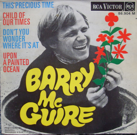 Barry McGuire né en 1935 est une tête de file de la chanson contestataire qui débuta vers le milieu des sixties. Physique imposant, voix grave, il vient des milieux du folk. Ses premiers enregistrements dans le style datent de 1961. Il va un peu à l’aventure et rencontre Hoyt Axton, bien que pas crédité, il est co-auteur de la chanon « Greenback Dollar ». En 1963, il se joint au New Chisty Minstrel, groupe qui connut un certain succès dont il composa le hit *Green Green » avec Randy Sparks. En 1965, il quitte la formation et enregistre l’un des premiers protest songs anti guerre du Vietnam « Eve Of Destruction » composée par P.F. Sloan, chanson qui ne lui valut pas que des amis parmi les milieux conservateurs. Publiée par Dunhill records, c’est une chanson dont le succès s’est fait tout seul, bannie sur plusieurs stations de radio, elle réussit néanmoins à atteindre la première place du hit parade américain. Pour la suite, il fallait quelque chose de très fort. Les Mamas and Papas qui avaient également signé chez Dunhill, connaissaient Barry. John Philips lui proposa une de ces chansons, « California Dreamin ». Elle fut enregistrée par Barry avec les Mamas and Papas qui faisaient le choeurs. Peu après, le producteur et fondateur du label Lou Adler se ravisa, il voulut donner la priorité à la chanson pour un disque des Mamas and Papas, ce qui fut fait avec le succès que l’on sait. Si on compare les deux versions, on remarque que le playback et les choeurs sont identiques. On a remplacé les vocaux et le solo d’harmonica par un solo de flûte. Malheureusement pour McGuire, ses enregistrements suivants n’eurent que peu ou pas du tout de succès, on lui fit un peu payer l’iconoclaste succès de sa chanson contestataire. Après de sérieux problèmes avec la drogue, il se tourne vers la religion. Mais il n’a jamais vraiment cessé de se produire et d’enregistrer, parfois des trucs religieux. Il vit toujours.