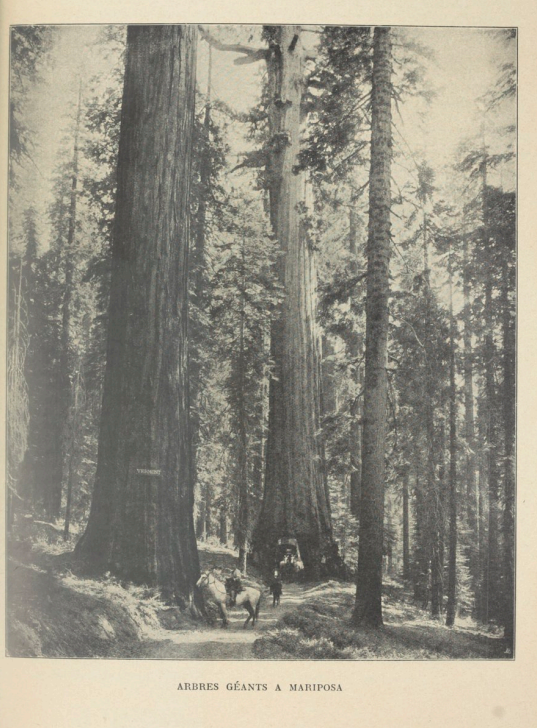 Le bois supérieur se compose de plus de 360 sequoias superbes, à quelques uns desquels le peuple a donné des noms plaisants. Ainsi il y a le Vieux garçon, qui étend languissamment ses branches du côté des Trois grâces, et le Couple fidèle aux rameaux tendrement enlacés; puis Wawona, à travers lequel une voiture peut passer également. Çà et là gisent, souverains déchus, mais encore admirables dans l’adversité, des colosses déracinés sur lesquels on grimpe à l’aide de marches taillées dans leur bois. La hauteur moyenne des géants de Mariposa est de 80 mètres; le tronc, de couleur rougeâtre, mesure 20 mètres de circonférence. Le bois est facile à travailler et très résistant. Ce n’est pas le red-wooddes monts de Santa-Cruz et de la chaîne côtière, connu chez nous sous le nom de Wellingtonia, mais le séquoia gigantea, dont le domaine unique est la vallée du Yosemite.