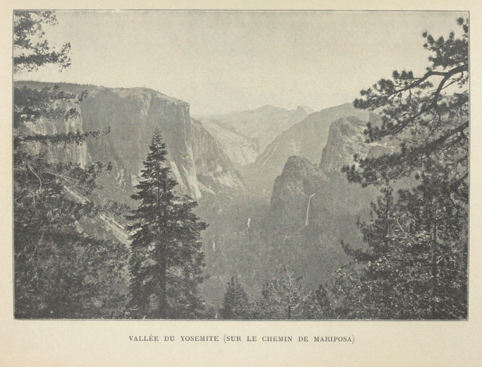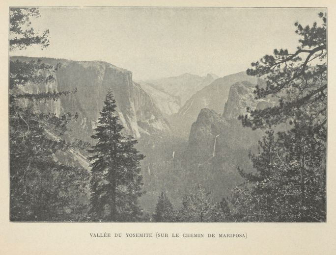 Le Yosemite — en langue indienne le Grand ours gris — se précipite en trois sauts gigantesques d’une hauteur de 770 mètres. En plein été — le 19 juillet — il déverse une masse d’eau bien supérieure à celle de nos cascades les plus renommées. Aussi l’imprudente qui voulut le contempler de trop près reçut-elle une douche qui, à cette saison et à travers la couche de poussière qui la recouvrait, lui parut délicieuse.