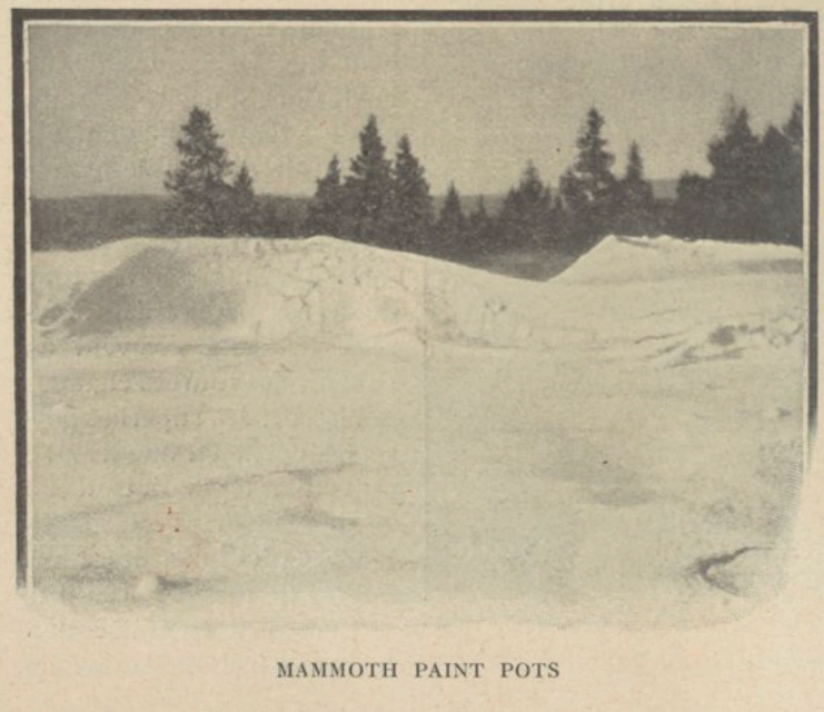 Dans la suite de son récit elle mentionne le geyser le plus célèbre du parc le Old Faithful (photo ci-dessus). Elle lui attribue un précision d’horloge pour ses éruptions, toutes les 63 minutes. Peut-être était-ce le cas lors de sa visite, mais aujourd’hui les éruptions varient entre 45 et 125 minutes, pour une durée de 1,5 à 5 minutes et d’une hauteur de 32 à 56 mètres.