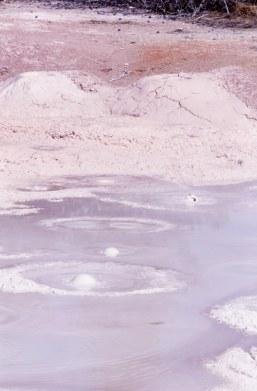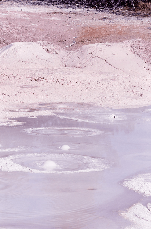 Le dîner fini, nous nous acheminons du côté de la Fontaine, grand geyser qui nous fit le plaisir de s’élancer dans l’air en notre honneur. Les pots à couleur, que les Américains appellent aussi mud puffs, furent plus gracieux que la Fontaine; ce sont de petites buttes des cratères en miniature, qui déversent une boue rose, verte, jaune ou blanche. Ce limon a servi à crépir les murs de l’hôtel. Dans chacun de ces trous, la masse bourbeuse gargouille, bouillonne, siffle, lance des bulles, qui forment sur le sol comme une végétation fantastique. Au bout d’un instant, toutes ces formations bizarres, fleurs multicolores, têtes de serpents, retombent dans le cratère. Spectacle merveilleux et incompréhensible que l’on voudrait suivre pendant des heures!