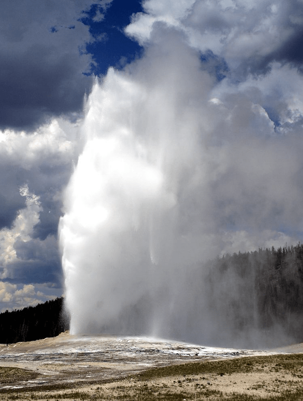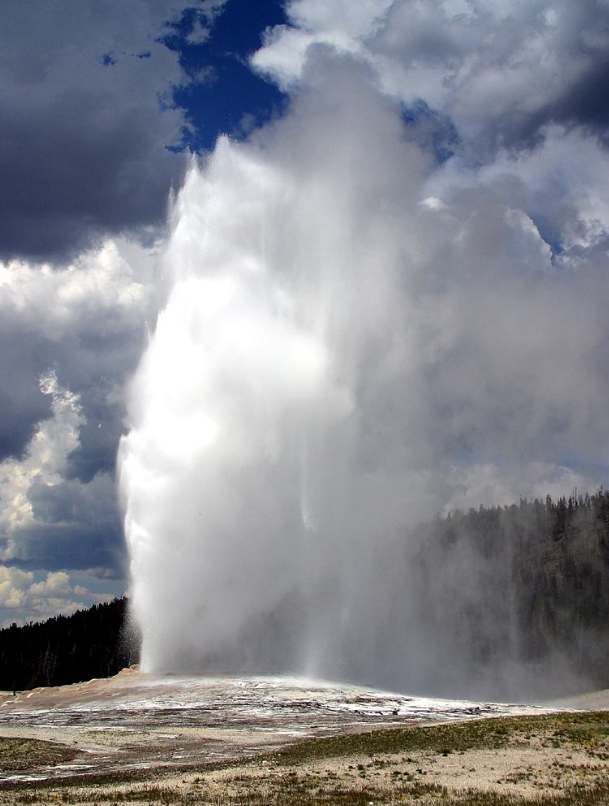 Non loin des tentes se trouve un geyser bien connu et très populaire, le Vieux Fidèle (Old Faithful), qui doit son nom à la régularité avec laquelle il fonctionne. Toutes les 63 minutes, exactement, nuit et jour, se produit une éruption; je n’en observai pas moins de cinq. Son cratère, en forme de parallélogramme, couronne une butte d’environ quatre mètres de hauteur, formée par des dépôts calcaires; cette butte est formée par de petites vasques superposées, dont les parois ont, sous l’eau aussi pure que du cristal, des étincellements de pierres précieuses et sont bordées d’un collier de perles. L’éruption du Vieux Fidèle s’annonce par quelques jets de courte durée, mais très forts. Tout à coup la colonne d’eau bouillante jaillit à une hauteur de quarante mètres. Pendant trois minutes le geyser lance sa gerbe colossale, puis retombe tout d’une pièce dans son cratère apaisé.