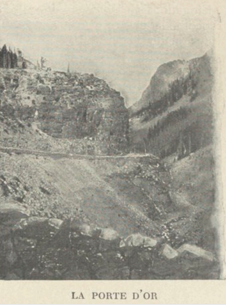 Nous fîmes, le premier jour, huit heures de voiture. Une pente assez raide nous conduisit dans une région sombre et sauvage entourée de rochers, qu’on appelle Hoodoos. Je n’ai pu savoir d’où vient ce nom, ni à quel travail de génies souterrains cette lugubre enceinte doit son origine (voir plus bas). Comme contraste, tout à côté, la Porte d’or, défilé de roches hardies couvertes d’une mousse jaune. Une cascade se précipite dans la vallée. Cette porte s’ouvre sur une ravissante prairie émaillée de fleurs entourée d’une ceinture de montagnes neigeuses.