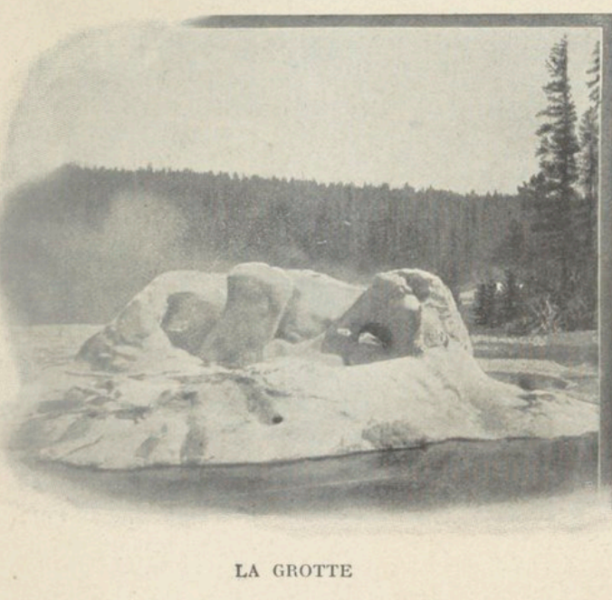 Nous continuons à pied notre chemin pour aller voir une série de geysers. La blanche couche de geyserite sur laquelle nous marchons porte le nom de celui qui l’a découverte, Norris Geyser Basin. Partout des arbres dénudés, immenses squelettes aux ossements blanchis, avertissent le voyageur que ce sol perfide tue la vie dans son germe. Notre guide avance prudemment; on aurait vite fait de mettre le pied dans une fissure, d’où on le retirerait affreusement brûlé. Tout autour de nous, pareils à des fusées, des jets s’élèvent en sifflant, des sources chaudes jaillissent; les superbes geysers lancent en une trombe puissante leurs flots d’eau et de vapeur; l’eau bouillonne et crépite, les tourbillons de fumée de soufre, se déroulent en mugissant. A chaque instant, de sourdes détonations ébranlent le sol. On se croirait dans quelque antre de cyclopes. Ici encore, la nature a prodigué ses plus brillantes couleurs; le moindre étang, la plus petite flaque s’irise de mille reflets. Les rayons du soleil qui prêtent les couleurs éblouissantes de l’arc-en-ciel aussi bien à l’eau bleue transparente qu’aux buées opaques les fait resplendir d’un éclat féerique. Chaque geyser porte un nom: le Black Growler, le Congress, le Monarch, etc.