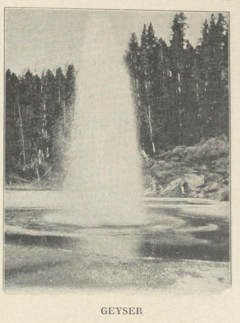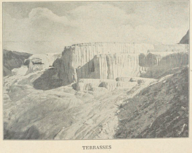 Le soir même de notre arrivée, nous grimpâmes, accompagnés d’un guide, sur les terrasses les plus rapprochées. Formées par les alluvions des sources chaudes — on en trouve ici plus de cinquante — ces plates-formes s’échelonnent jusqu’à une hauteur de 300 mètres et se déploient sur une égale largeur. Depuis que les fameuses terrasses de la Nouvelle-Zélande ont été détruites, celles de Yellowstone sont les seules qui existent. Comment les dépeindre? On ne peut le faire mieux qu’en les comparant à des cascades pétrifiées ou congelées. Du reste le phénomène qui les a formées continue. Chacune des vasques dans lesquelles s’écoule le trop plein des bassins supérieurs est remplie d’une eau bleue comme du saphir, dans laquelle ondoient de longs filaments verts, jaunes, rouges, bruns, blancs. Ce sont des couvertes, espèce d’algues qui se plaît dans ces eaux chaudes. L’eau qui glisse le long des parois d’albâtre les nuance graduellement de toute la gamme des jaunes, depuis la teinte d’or la plus claire jusqu’à celle de l’orange foncé. Les vapeurs de soufre qui flottent au-dessus ajoutent encore à la magie de cette succession de fontaines somptueuses. Dessus ajoutent encore à la magie de cette succession de fontaines somptueuses. La température des sources varie entre 20 et 100° centigrades. Saturées de substances minérales, elles tiennent encore d’autres couleurs en réserve. Les tons de la plus riche palette, le vert, le rose-saumon, le rouge, le brun-clair, l’ocre foncé, rivalisent de finesse et de brillant avec l’azur transparent de l’eau et la blancheur nacrée des marches du gigantesque escalier. Ce jour-là, nous vîmes aussi des geysers en miniature, puis un lac bleu dont on ne connaît pas l’écoulement et dont la température reste constante en été et en hiver.
