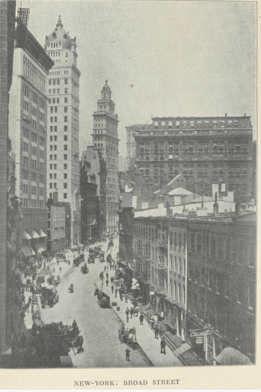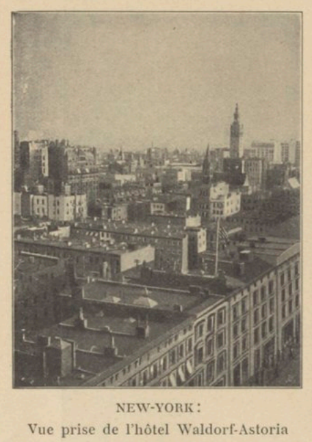 Je parcourus en tramway le plus de rues possible et j’eus maintes fois l’occasion de m’étonner des contrastes qu’offre New-York, non seulement dans ses différents quartiers, mais aussi dans le style des constructions d’une même rue. Des sky-scrapers, énormes immeubles de location, des hôtels de quinze étages et plus coudoient de vieilles petites maisons de bois. Ailleurs, une gracieuse église gothique, aux murs tapissés de lierre, vient rompre l’alignement banal des bâtisses modernes, qui sont en général plus remarquables par leurs proportions gigantesques que par l’originalité de leur architecture