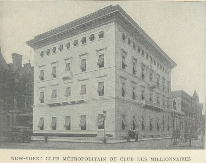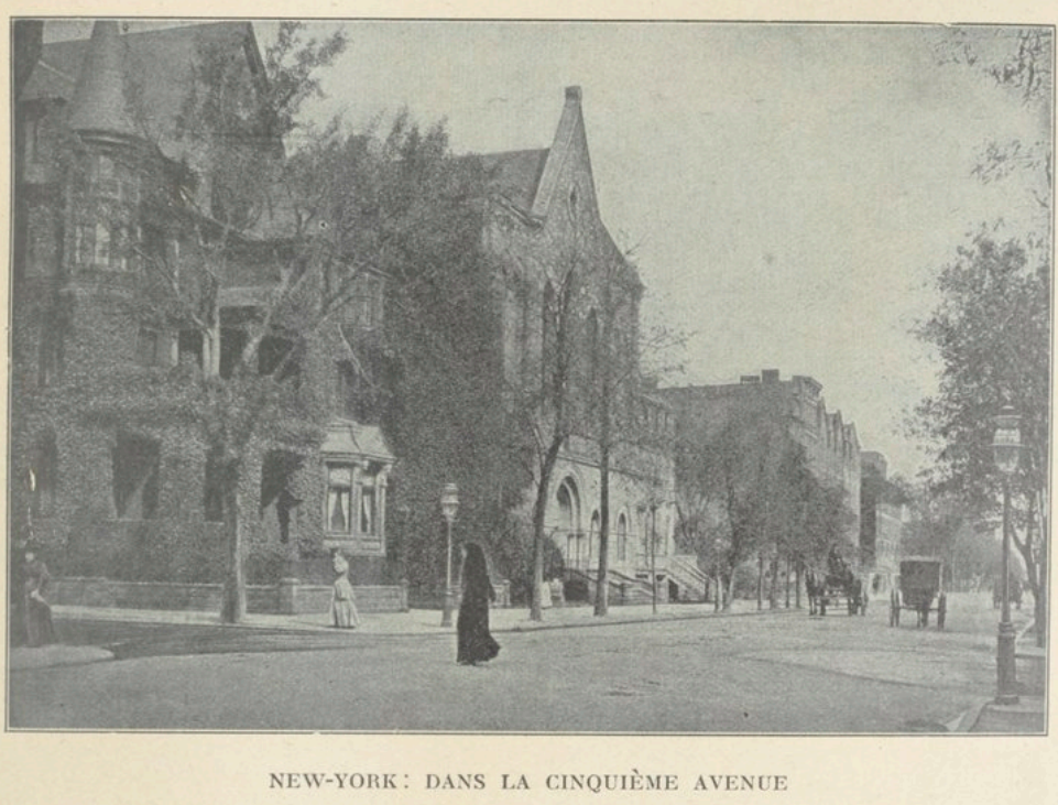 A partir de la 45e rue, qui croise la Cinquième Avenue, celle-ci n’est plus bordée que de palais et d’hôtels particuliers, construits presque tous dans le style gothique anglais. Le palais Renaissance italienne de Mme V. H. Vanderbilt et celui du club métropolitain, nommé aussi club des millionnaires, rompent agréablement l’uniformité du style. La résidence de Cornélius Vanderbilt, également d’architecture anglaise, se trouve dans la Cinquième Avenue, où l’on voit encore la gare centrale, l’Académie de médecine, l’Université Colombia, la cathédrale de Saint- Patrice, la bibliothèque Lenox, l’Académie nationale de dessin, un arsenal, Ecole normale, qui compte 1600 élèves, des églises, ainsi que plusieurs autres édifices publics.