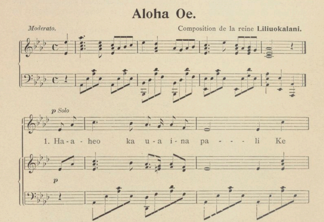 Sur ces paroles se termine le séjour à Hawaï avec le chant du départ version locale. Extrait d’une partition cette célèbre chanson « Aloha » qui veut dire au-revoir. Ce fut d’ailleurs plus tard le titre d’un album d’Elvis Presley « Aloha From Hawaï ». Comme on peut le remarquer sur la partition, la composition en est attribuée à la reine Liliuokalani. Dans la logique d’un tour du monde d’est en ouest, la prochaine étape sera le Japon, pays encore plus mystérieux pour une Européenne.