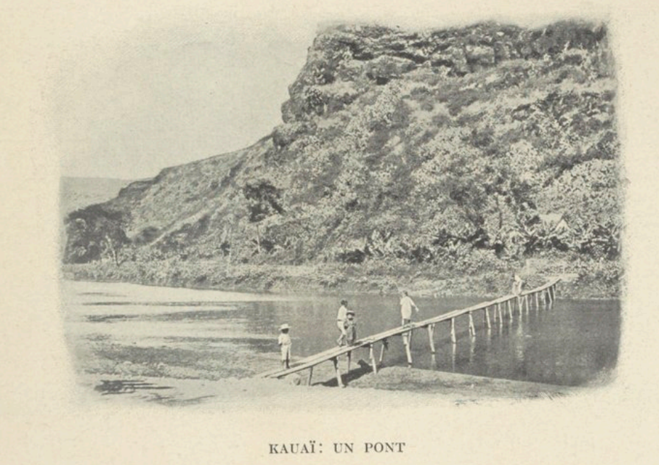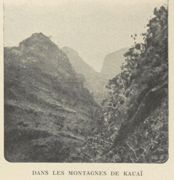 Je ne devais pas quitter Kauaï sans visiter l’intérieur luxueux d’un propriétaire de plantation. Là, les produits hawaïens, parmi lesquels j’admirai de fines nattes aux couleurs harmonieusement disposées, rivalisent avec les produits de l’art et de l’industrie européens. La salle de musique contient non seulement un superbe piano à queue, mais encore un pianola, invention américaine qui fàit fureur en ce moment et pénètre partout. Les jardins, arrosés par de nombreux ruisseaux, sont d’une grande beauté. La petite île de Kauaï, de 1418 kilomètres carrés, n’a pas moins de 13 rivières.